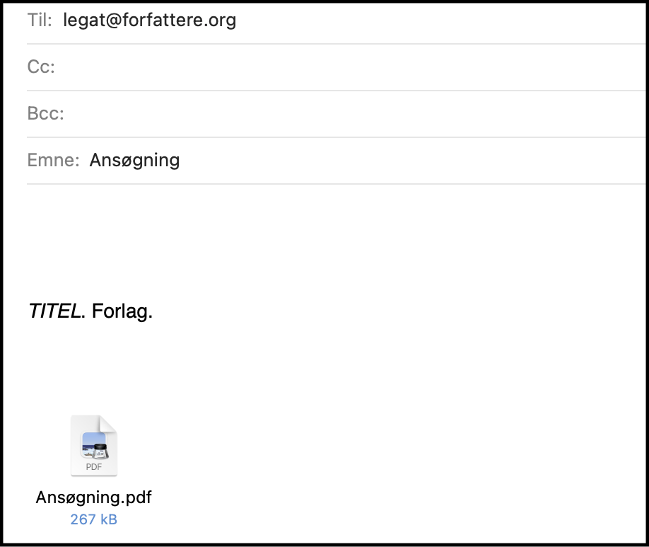 Eksempel på ansøgning: Mailens brødtekst oplyser om titel og forlag på mindst én udgivelse, og der er vedhæftet et dokument med ansøgningen.