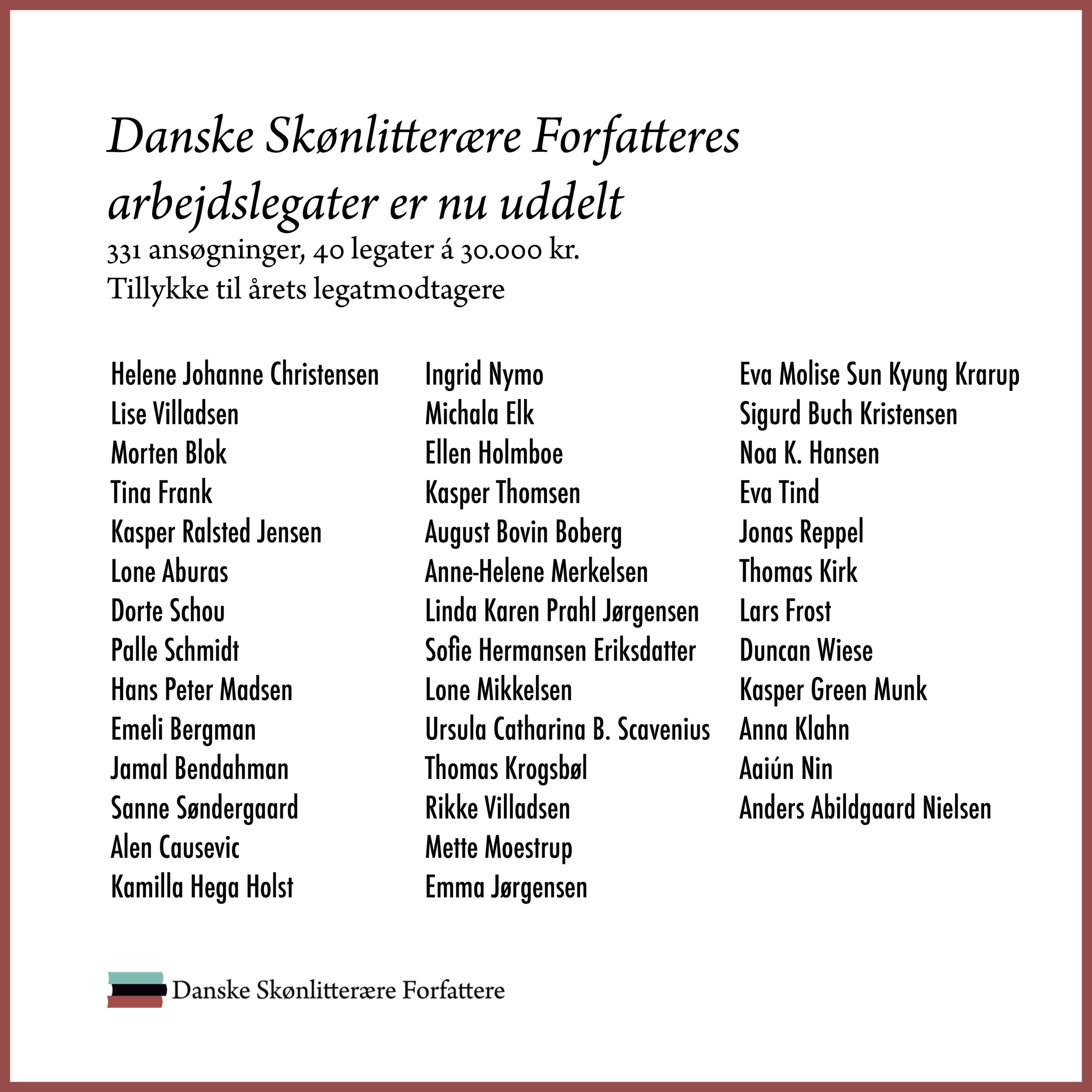 Stort tillykke til årets modtagere af Danske Skønlitterære Forfatteres arbejdslegater.